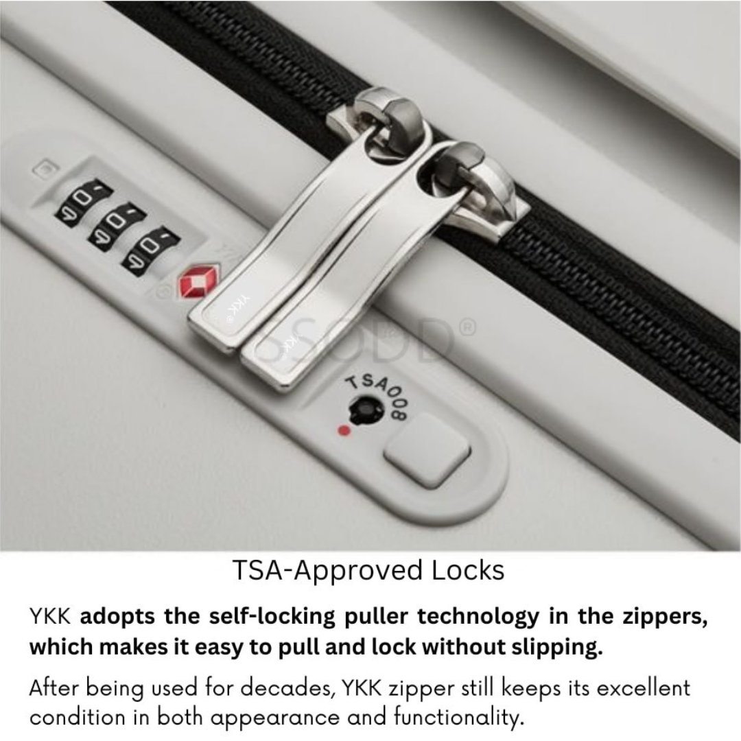 【Quality Accesseries】High quality YKK brand zipper which use 5 strands to protect zipper teeth, after 9,000 times slide-test, the zipper is still smooth.American SJ Turbo mute spinner wheels, less noise more elegant. With TSA lock, it can easy pass most international countries customs security check without damaged the suitcase.